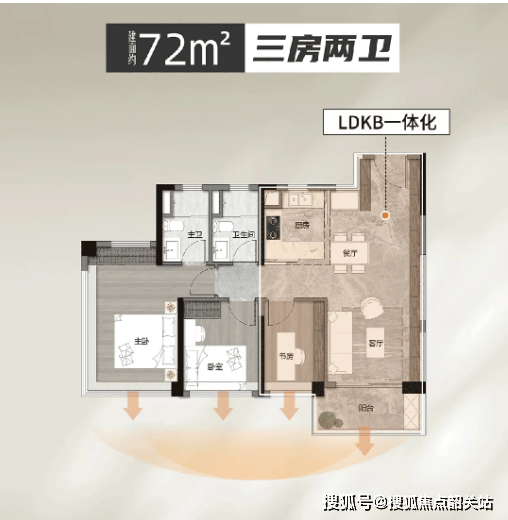 72㎡三房两卫:天河罕见的最小面积双卫三房,四开间朝南,带入户花园与南向阳台,功能堪比传统90㎡产品;