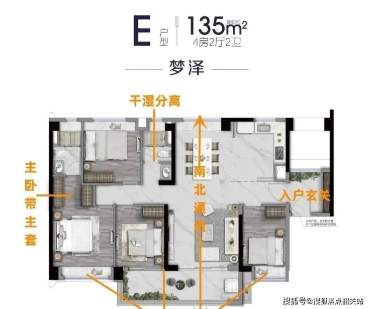 135平米四房两卫:南北通透,餐客厅一体化设计,总价约为560-590万元。
