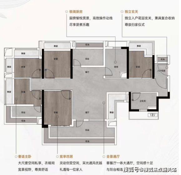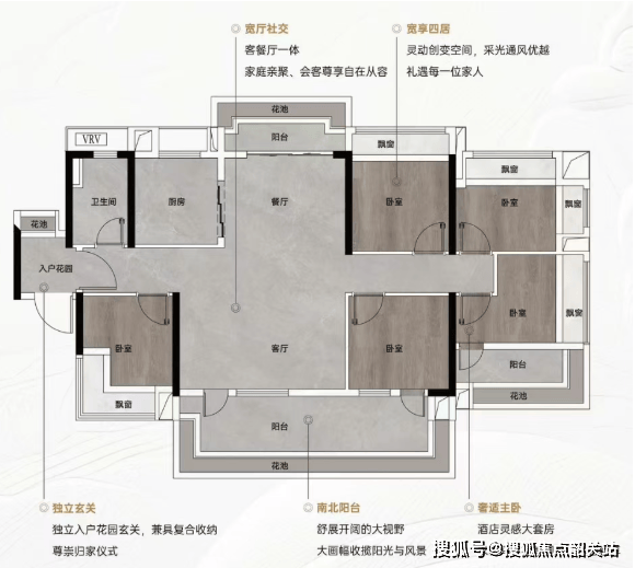 建面约115-116㎡南北对流四房:四开间甚至4.5开间朝南,南北通透。南面宽阳台加花池赠送,北面餐厅亦设花池可改餐边柜,形成完美对流。主卧L型花池设计,景观面大且不占室内面积,实用性极强。