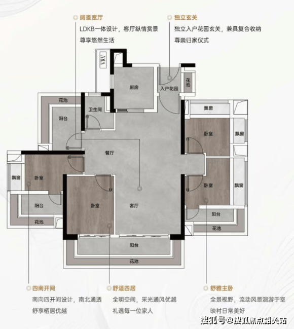 建面约102㎡飞机户型四房:经典的飞机户型设计,南面景观开阔,朝阳面宽。LDKB一体化设计扩大了会客空间,四周环绕花池与飘窗,赠送面积极高,实现了小面积做大四房的奇迹。