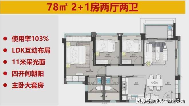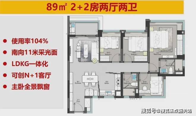 户型亮点多多,窗地比达到 0.26,超过市面上一般项目标准。楼栋蝶形设计让每一户都是单边位,实现南北通透。主套设计很贴心,像建面约 78㎡北向单位和 89㎡南向单位都朝南,而且 78㎡户型利用主卧飘窗对流,巧妙避开卫生间异味,居住舒适性大大提高。