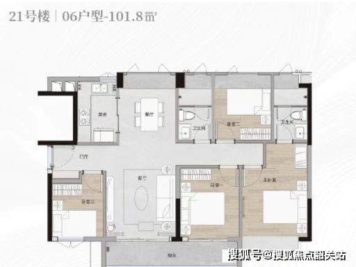 户型空间方面,项目住宅产品以三房与四房户型为主,采用独立玄关、客餐厅连接、功能分区明确的室内结构。部分户型采用双卫设计,以适应家庭成员使用需求。同时,户型设计注重区域分布完整性,使公共空间与私密空间分布合理。部分户型具备南向采光面或景观朝向,使自然光线与景观资源进入室内空间。