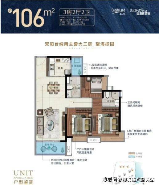 85㎡三房:三开间布局,主卧朝南,阳台可观园景或海景,适合年轻家庭;