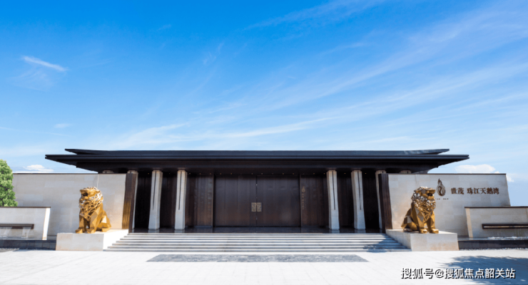 其次,世茂珠江天鹅湾的大门,名曰“青云门”,高约8米,宽至约40米,采用皇家宫门形象,与故宫太和殿采用了相同的重檐顶结构,再辅以两边手工打造高达3.5米的、古时用于护国镇宅的狮子雕塑,用超尺寸的精神符号植入,去匹配业主的格调。