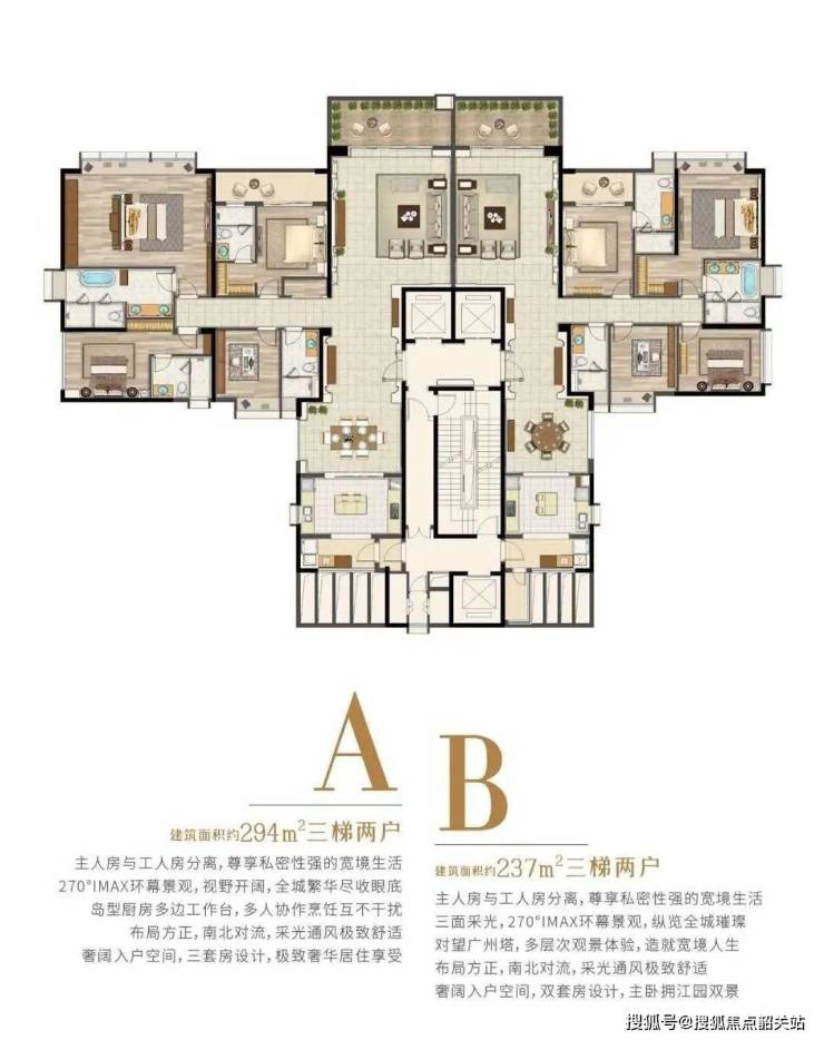 项目首推建面约237平和建面约294平的四房单位,融入江景、都市风光、品质家居、套房设计等元素,珠江天鹅湾的大宅风范。