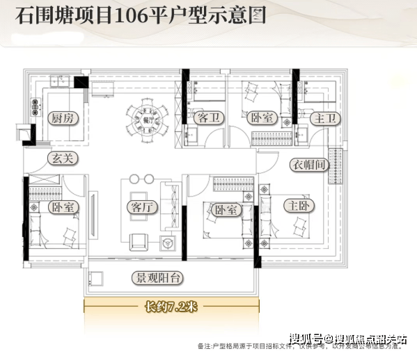 建面约106㎡四房两厅两卫:作为87平边户的“升级版”,106平户型全部采用单边位设计,私密性更佳。其阳台长度延伸至约7.2米,并连通次卧,形成了超大的空中花园。入户处的书房升级为标准次卧,主卧空间也更加阔绰,足以容纳衣帽间和豪华卫浴。这是一个专为追求品质生活的家庭打造的终极刚改产品。