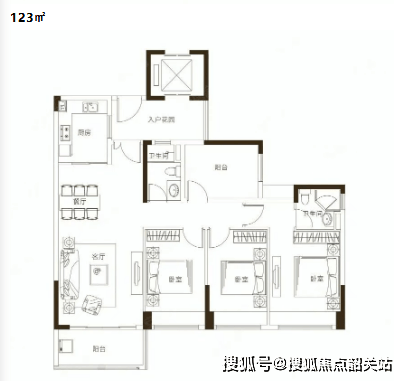 123㎡三房户型则在空间尺度上有了显著提升,采用三房两厅两卫的布局,功能更加完善。客厅开间达4.2米,采光充足,视野开阔,是家庭聚会与休闲娱乐的理想场所。主卧套房设计,配备独立卫生间与衣帽间,彰显主人的尊贵身份。两个次卧大小适中,布局合理,可满足多代同堂家庭的居住需求。厨房采用U型设计,操作台面宽敞,储物空间充足,方便日常烹饪。阳台连接客厅与次卧,形成双阳台设计,既增加了采光面积,又提供了晾晒与休闲的双重功能。