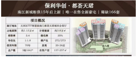 【保利华创·都荟天珺】占地面积为11,000平方米,建筑面积达38,000平方米,容积率为3.4,绿化率达到了35%。整个项目共有3栋高层住宅楼,层高分别为20至26层,总户数仅166户,户型涵盖157至257平方米的大平层。项目特别设计抬高约30米,延展架空层立体都市园林,提升了整体景观视野和私密性。小区还自建了一所公立幼儿园,并对口广州市华颖外国语学校(九年一贯制),提供了优质的教育资源。
