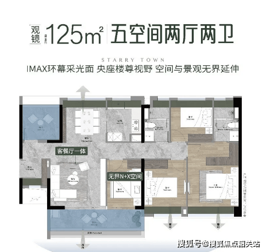 【125㎡ 5空间2厅2卫】:该户型为改善型大户型,4.5开间朝南,客餐厅实现南北对流,通风采光效果极佳,打造舒适阳光宅,让室内每个空间都能充分享受阳光和新鲜空气。户型采用餐客一体化设计,打造百变大方厅,空间开阔,能够满足家庭聚餐、朋友聚会等多样化生活需求,同时可根据居民需求灵活划分空间,提升空间利用率;配备双面宽观景阳台,南北满飘窗,进一步增加了室内使用面积,同时视野开阔,能够欣赏社区及周边景观,提升居住体验;户型设计注重舒适性与实用性,五个空间布局合理,可满足多人口家庭的居住需求,主卧配备独立卫生间和衣帽间,私密性强,提升居住舒适度。该户型适合多人口家庭或有高端改善需求的家庭居住,能够充分满足家庭的多样化居住需求。