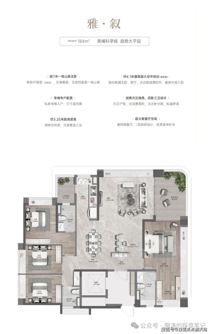 184㎡舒适阳光四房:约7米一线山景主卧,采光观景怡然自得。约4.1米超大面宽空中阳台,专梯专户配置,私密性强。适合追求品质与隐私的家庭。