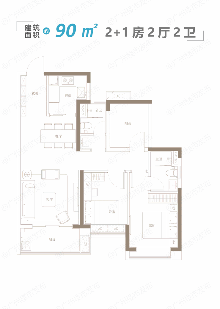 建面约90平2+1房则是双卫设计,适合三代同堂家庭。
