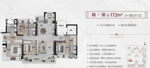 172平米3+1房3卫:南北对流双阳台,南向奢阔双主套,4开间朝南约17.5米全面屏采光,270°环幕大视野,营造极致居住体验。