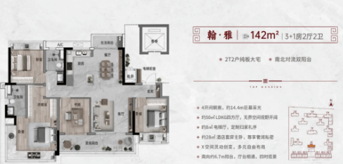 142平米3+1房2卫:4开间朝南,约14.4米全面屏采光,约28平米酒店套房主卧,彰显奢华生活品质。