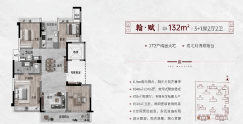 131平米3+1房2卫:南北对流双阳台设计,南面约6.9米全屏观景阳台,提供开阔视野。
