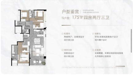 项目户型设计以110~175㎡四房为主,兼顾改善型家庭及高知精英群体居住需求,均为南向布局,最大限度享受阳光与通风。物业管理由广州越秀物业发展有限公司负责,物业费3.8元/㎡/月,为业主提供专业高品质管理服务。小区注重人与自然的和谐共生,整体规划强调景观与建筑空间融合,为居民打造舒适、宜居的生活环境。
