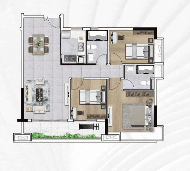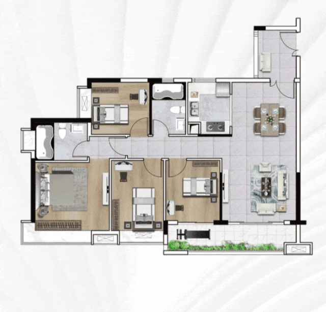 预算充足的买家,还可以选择建面约129㎡户型,四房带套间,并同时集合了以上户型的入户花园、大阳台(约6.6米)等亮点,直接一步到位。