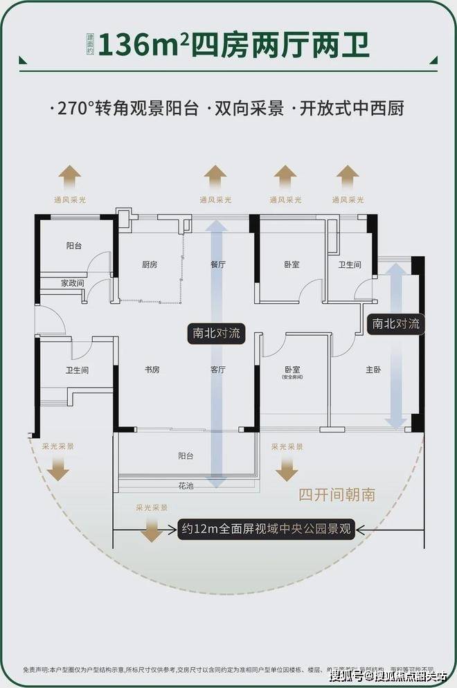 采光通风:全南向布局,大面宽阳台和飘窗设计,通风效果佳,阳光可直达室内深处。