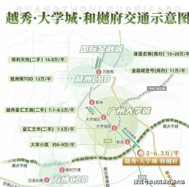 项目距离地铁4号线新造站约800米,4站直达琶洲、5站到金融城,换乘3号线可快速抵达珠江新城;自驾可通过南大干线、金光东隧道(已通车)连接番禺核心板块与大学城一期,30分钟内覆盖万博CBD、琶洲会展中心、金融城等核心商务区,实现“工作与生活的快速切换”。