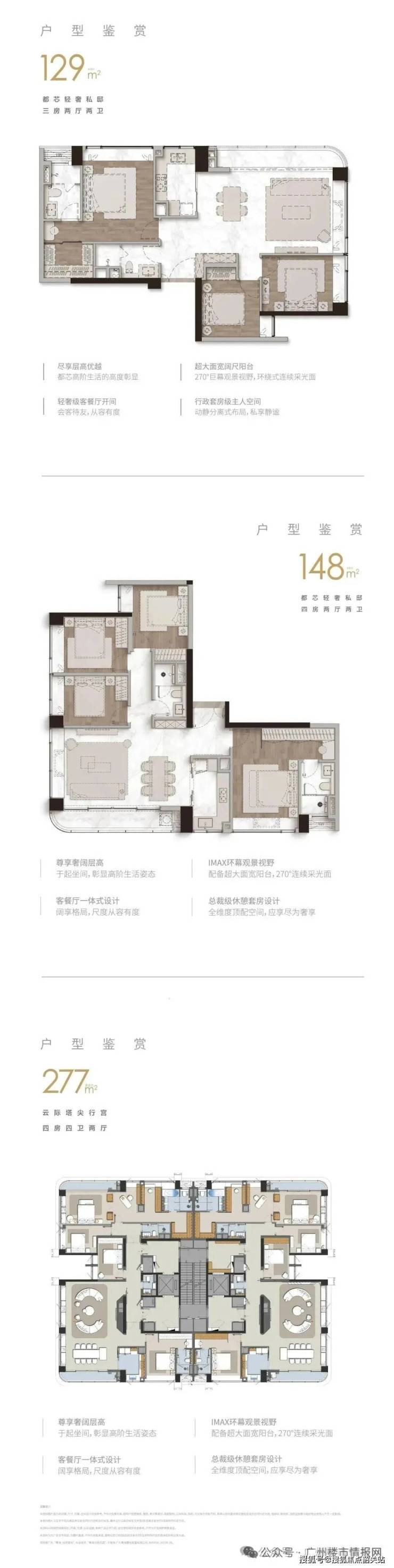 住宅组团【桂府壹号】采用纯围合式布局,共计 9 栋住宅楼栋,楼层控制在 25 层至 35 层,主打建面约 140-264㎡现代美学大平层,户型格局方正通透,南北对流设计为主,大横厅、大阳台、全景落地窗等高端设计标配,室内空间利用率高,动静分区合理,适合三口之家、二胎家庭、三代同堂改善自住,阔绰空间满足高品质居家需求,目前住宅清栋房源有限,专属让利力度空前,是入手白云中轴顶奢大平层的绝佳时机。