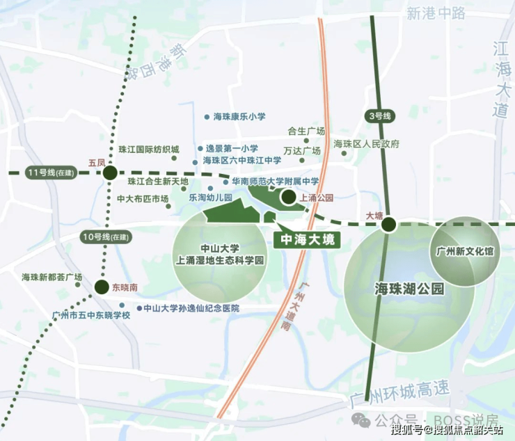 中海大境周边汇聚全维度优质配套,生态、教育、商业、医疗资源环伺,在城央繁华之中为居者打造兼具自然治愈与烟火气息的生活天地,全方位满足高净值家庭的日常所需。生态资源得天独厚,一路之隔就是1100万㎡海珠国家湿地公园,周边还有上涌果树公园、海珠湖公园环绕,湿地作为广州“绿心”“南肺”,空气负氧离子含量是普通城市街道的5倍以上,日常漫步公园、沿江休闲,可轻松逃离都市喧嚣,享受自然治愈。教育配套完善且优质,项目配建有托儿所与6班幼儿园,西侧规划96班中大附属创新谷学校,其中小学由中海配建,预计2027年9月建成,周边还有华附海珠国际双语学校,西北面2公里处就是中山大学,全龄段教育资源丰富,助力子女成长。商业配套成熟且具成长性,下楼过河即达项目配建的4万㎡滨水商业街区,以新加坡vivo city为设计蓝本,计划2026年逐步开业,步行10分钟可达海珠万达广场、合生广场,超20万㎡商业集群可满足购物、餐饮、娱乐等多元需求。医疗配套坚实可靠,3公里范围内汇聚南方医科大学珠江医院、广医二院、广东省第二人民医院等多家甲级医院,为家人健康保驾护航。