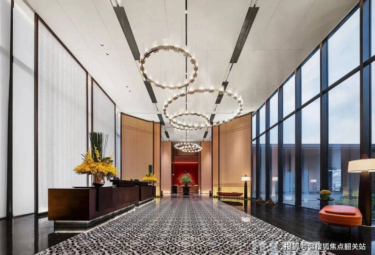 归家礼序,多重院落,渐进式归家礼序。酒店式落客空间,营造高端度假体验的归家动线。度假式酒店入户大堂,“红毯”归家路。大堂会客厅通透幕墙设计,潮领时代审美高度。