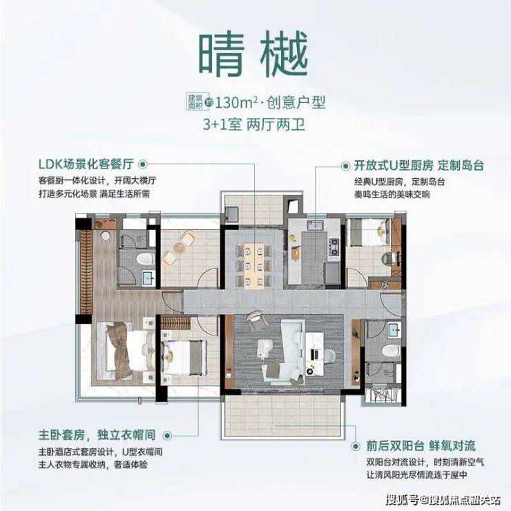 建筑面积约130㎡, 3+1室两厅两卫,主卧配套衣帽间,开放式明厨,酒店式主卧套房,270度飘窗。