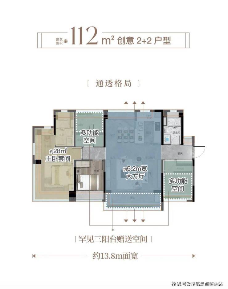 建面约115㎡四房:南北对流+双主套设计,客厅开间达4.2米,可容纳6人家庭聚会;
