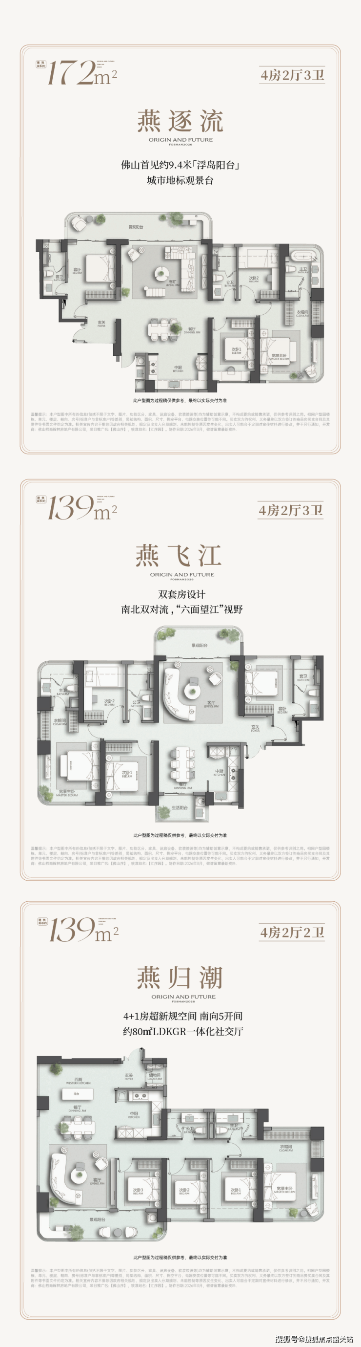 该设计组合从改善人群核心需求出发,实现三大优化:一是 LDKRG 空间打破壁垒,促进家人互动,满足家庭社交需求;二是 5 开间南向最大化采光通风,提升居住健康性与舒适度;三是双主套保障居住私密性,兼顾多代同堂便利性。三种设计相互配合,既解决传统户型空间封闭、采光不足、隐私性差等痛点,又贴合高端改善人群对空间、健康、私密的核心需求,这种全方位优化的户型设计,在佛山改善市场中具备明显不可替代性。