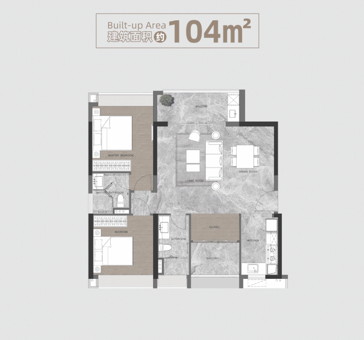 建面约104平三房户型就更绝了,居然能做到横厅设计,且实现了南北对流,最大程度地保证了景观视野和尺度感。