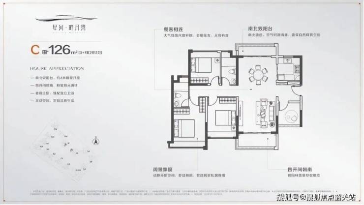 126㎡ 3+1房2卫(南北双阳台):南北通透,双阳台设计兼顾景观与实用,特别适合追求改善型居住体验的家庭。