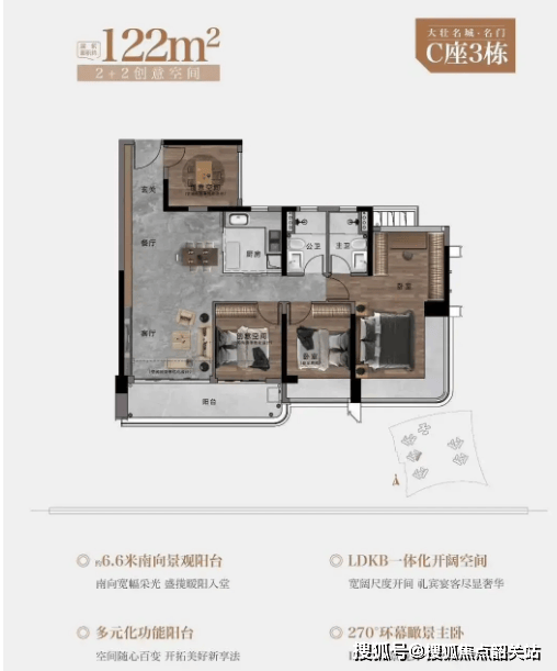 特色设计:该户型亮点突出,拥有约6.6M南向景观阳台+270°环幕瞰景主卧+多元化功能阳台,南向景观阳台宽约1.5米、长约6.6米,视野开阔,可俯瞰社区园林和周边景观,同时可作为休闲区、晾晒区、养花区等,满足业主多样化需求;多元化功能阳台可作为生活阳台,用于晾晒、储物,与景观阳台分离,提升居住舒适度;主卧配备270°环幕飘窗和独立衣帽间、卫生间,空间宽敞,质感十足,居住舒适度拉满。此外,该户型4开间朝南,采光充足,全屋通透,实用率超100%,空间利用率高,交标升级,配备全屋中央空调和高端家装品牌,适合改善型家庭居住。