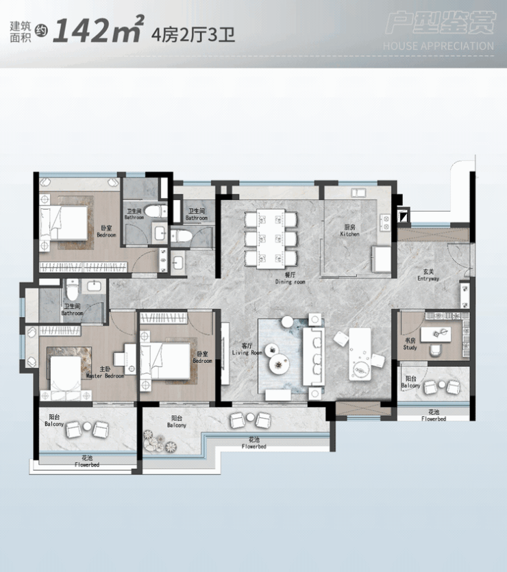 ✨ 140㎡四房两厅三卫:高端改善户型,总价约750万起,专梯专户设计提升私密性与尊贵感。主卧为豪华套房配置,包含独立衣帽间、双台盆卫浴与超大观景飘窗;客餐厅面宽达6.8米,搭配全景阳台,视野开阔;全屋采用广州首个分户式七恒全屋气候系统,智能调节温度、湿度,打造健康舒适的居住环境,适合追求生活品质的高知家庭与企业主。