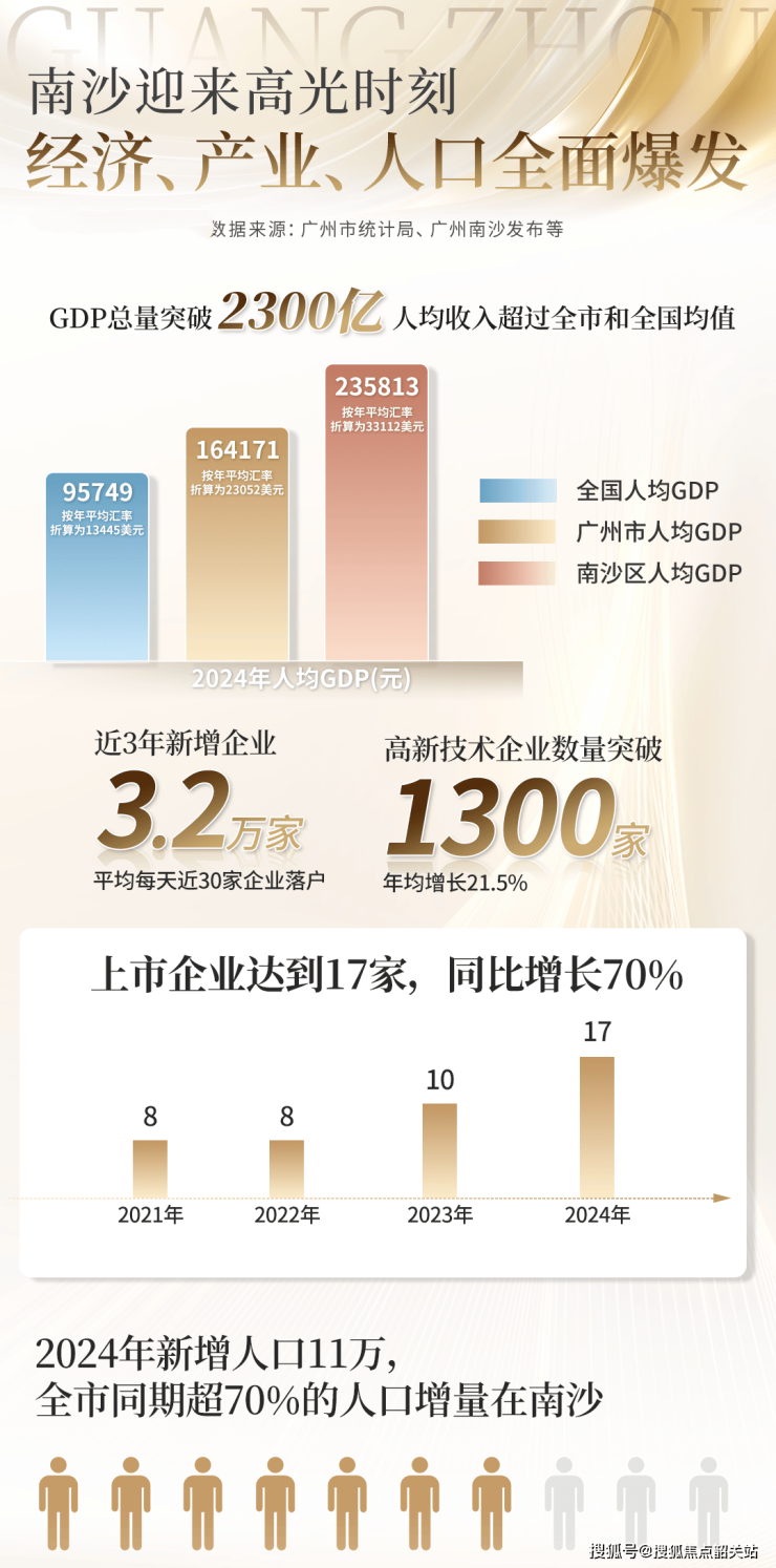南沙作为国家级新区、自贸试验区、粤港澳合作示范区,肩负多重国家战略重任,90 项省级行政职权下放、"双 15%" 税收优惠等独有政策红利,使其成为产业孵化器和人才聚集地。2023 年南沙 GDP 增速全市第一,已突破 2300 亿,3 年新增企业约 3.2 万家,高新技术企业超 1300 家,商业航天、新能源汽车等重点产业蓬勃发展,近一年实有人口增加超 11 万人,占全市 7 成,区域发展势头强劲。