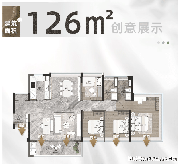 嘉悦云启的产品力,在户型设计上体现得淋漓尽致。全系83-126㎡四至五房,全部南向布局,得房率在新规下仍保持较高水平。83㎡做到南向三房两卫,单边位设计提升套内面积;99㎡四房配备IMAX宽景阳台+主卧三面环幕飘窗,景观与尺度兼得;109㎡南北对流四房,双阳台+4.5开间朝南,次卧可灵活打通客厅改宽厅;126㎡五房更是5.5开间朝南,四间卧室全南向,玄关预留800库收纳系统。所有户型均注重“空间弹性”与“情绪价值”——如99㎡的“超聚厅”概念,通过多功能房与阳台的灵活组合,实现社交、休闲、办公场景自由切换。这不仅是物理空间的优化,更是对现代家庭生活方式的深度洞察。