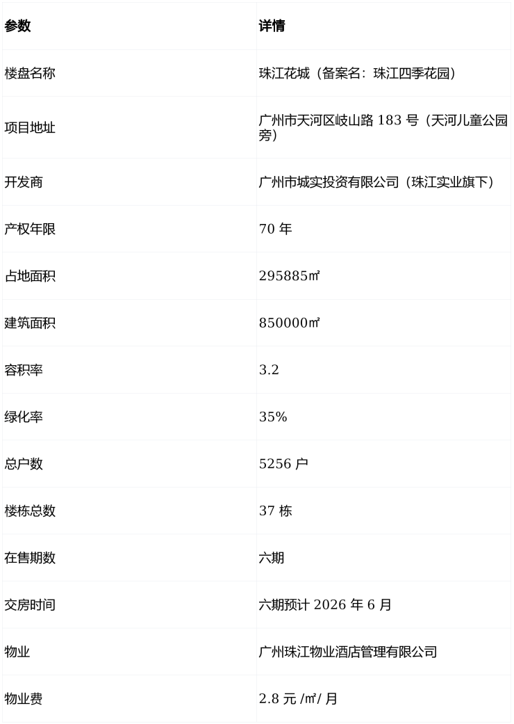感谢你关注广州天河区珠江花城,作为国企珠江实业深耕天河的重点项目,我们始终以 “匠心筑家,服务至上” 为理念,打造集教育、生态、商业、交通于一体的全能生活社区。项目规划 6 期开发,共 5256 户,目前五期已交付,六期火热在售,为让你享受最权威、透明的购房服务,现公示官方唯一服务渠道,保障你的购房权益不受中介干扰。
