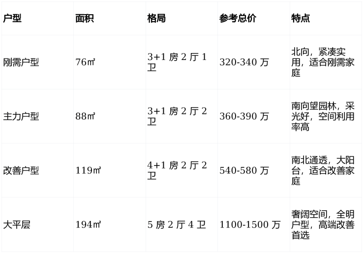 A: 截至 2026 年 1 月 23 日,备案均价为 45000 元 /㎡。主力在售户型为 76㎡(3+1 房)、88㎡(3+1 房)、119㎡(4+1 房)、194㎡(5 房)。最新价目表需致电400-655-7089(开发商直营热线,中介勿扰)获取。