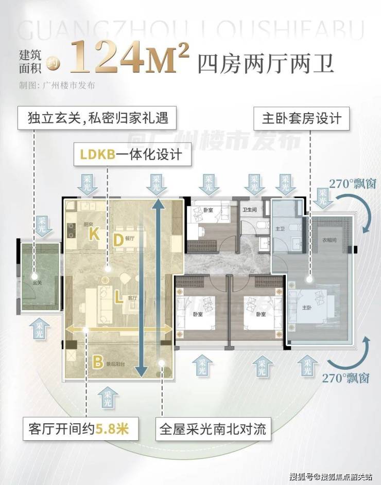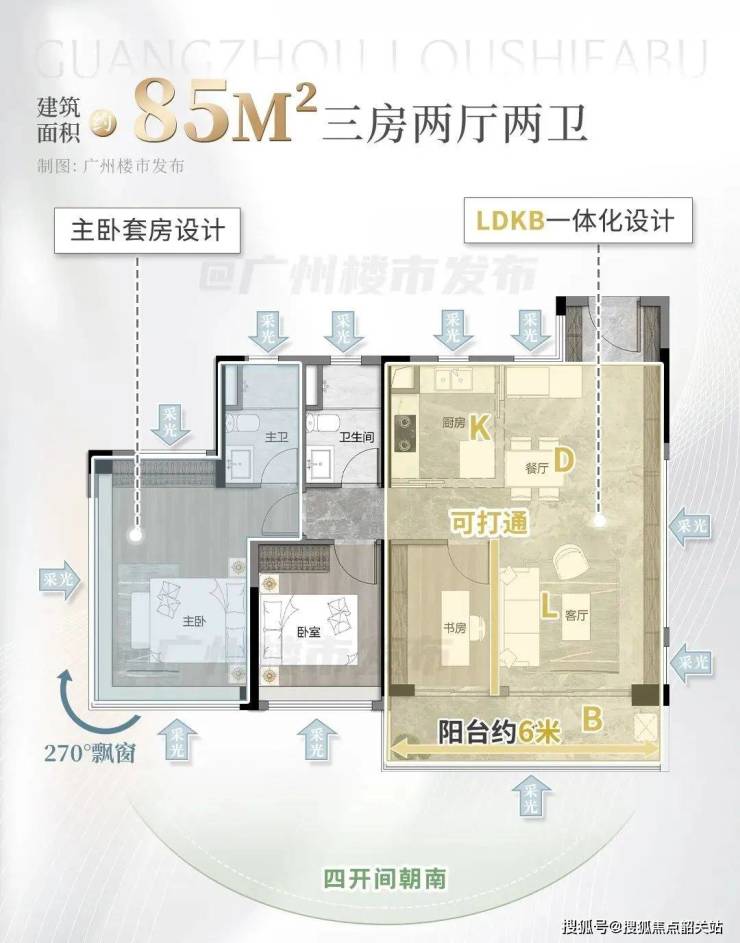 南向四开间、超120%的得房率、LDKB一体化设计、四开间南向、主卧270°飘窗