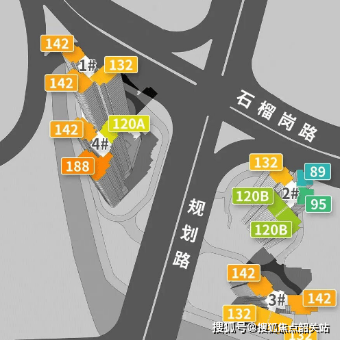 项目共分成两个地块,规划了4栋29-30层住宅,其中2号楼有两条梯腿为政府回购人才房,1栋和4栋位于西边的地块,2栋和3栋位于东边的地块,两个地块之间规划了一条市政路,未来等红卫村旧改完成后,可直达琶洲CBD。项目楼下三层是商业,四楼为架空层,未来电梯可直达地铁站,实现“地铁入户”,让业主的归家更加便捷。