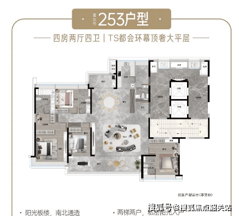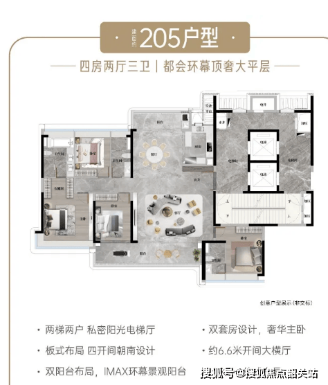 专梯专户,约 10.3 米宽巨幕阳台,双主卧套房,总统级主卧(含双洗手台、浴缸),五房设计满足多代同堂与高端社交需求,是板块内高端改善标杆户型。