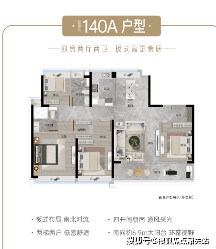 A 户型享高层开阔景观,B 户型北瞰园林南望校园,约 7.5 米宽阳台,四开间朝南,全屋精装,酒店式星级居住体验,适合三口之家或二胎家庭。