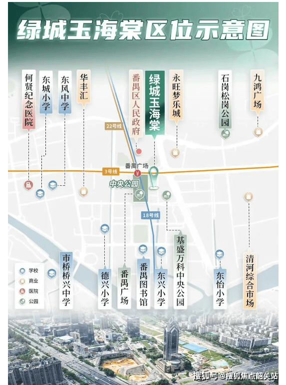 绿城玉海棠紧邻番禺广场地铁站E口,这里汇聚了包括18号线、22号线、3号线、3号线东延段及规划中的17号线在内的五条地铁线,形成了一个超级TOD交通枢纽,极大地提升了居民的出行便利性。同时,亚运大道与番禺大道的交错也为自驾出行提供了极大的便利。