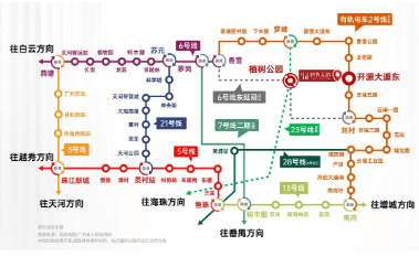 交通出行较为便捷。虽距离地铁 6 号线香雪站约 3.8 公里,但小区门口即为黄埔有轨电车 2 号线开源大道东站,乘坐有轨电车 5 站可达香雪站,无缝接驳 6 号线,畅达天河、海珠、越秀等地。同时,规划中的 6 号线东延段与 23 号线将在附近的植树公园站交汇,未来交通便利性将进一步提升。对于自驾业主,周边交通干线密布,出行顺畅,无论是日常通勤还是外出游玩,都能轻松实现。