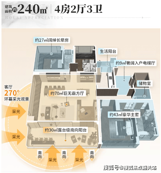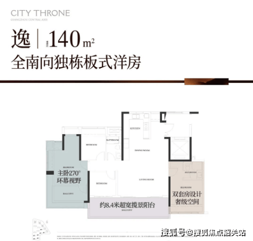 约8.4米南向巨幕阳台 + 主卧270°飘窗;
