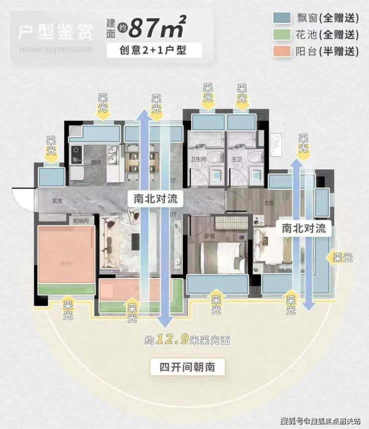 87A户型:四开间朝南,南北通透,拥有奢阔横厅和主卧L型飘窗。