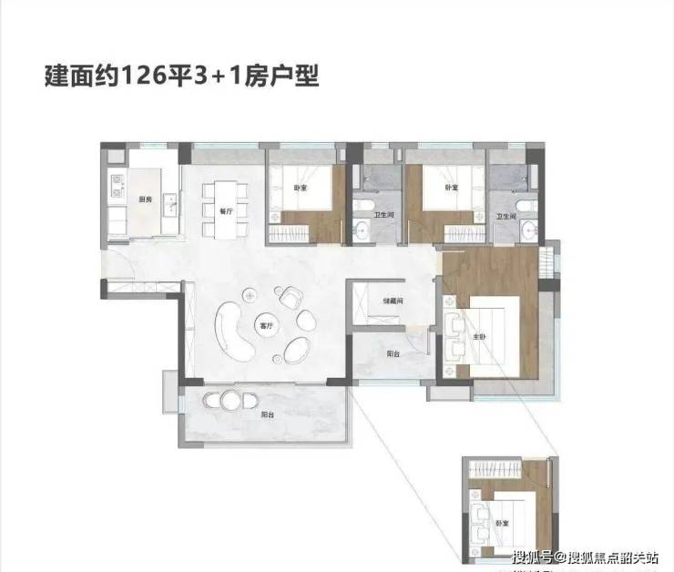 户型设计上,保利·领秀海还藏了不少巧思。有建面约74、84、95、120、126、139平三至四房设计,非常丰富。