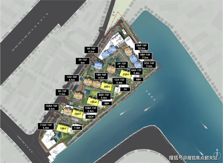 户型排布从石榴岗河自东向西依次升高,保证了约300米宽的生态水景面。