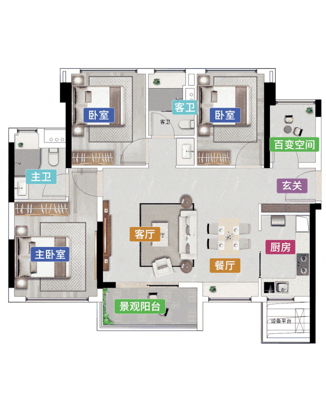 76㎡3+1 房:餐厅、客厅连通布局,低总价晋阶天河 。