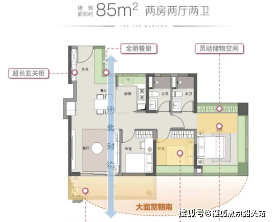 85平户型为两房两厅一卫设计,布局紧凑合理,空间利用率高。该户型客厅连接阳台,采光通风效果好,阳台面积宽敞,可作为休闲娱乐或晾晒区域;主卧和次卧均为南向设计,采光充足,居住舒适;厨房采用U型设计,操作空间宽敞,方便居民烹饪美食;卫生间干湿分离,保持了室内的干燥整洁。