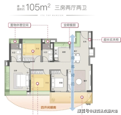 123平户型为三房两厅两卫设计,相比105平户型,空间更为宽敞。该户型采用南北通透的设计,通风效果极佳;客厅面积宽敞,连接超大阳台,采光充足,视野开阔;主卧套房设计,配备独立卫生间、衣帽间和飘窗,居住体验极佳;次卧和儿童房空间充足,能满足家庭的居住需求;厨房和餐厅相邻,方便居民用餐和烹饪。