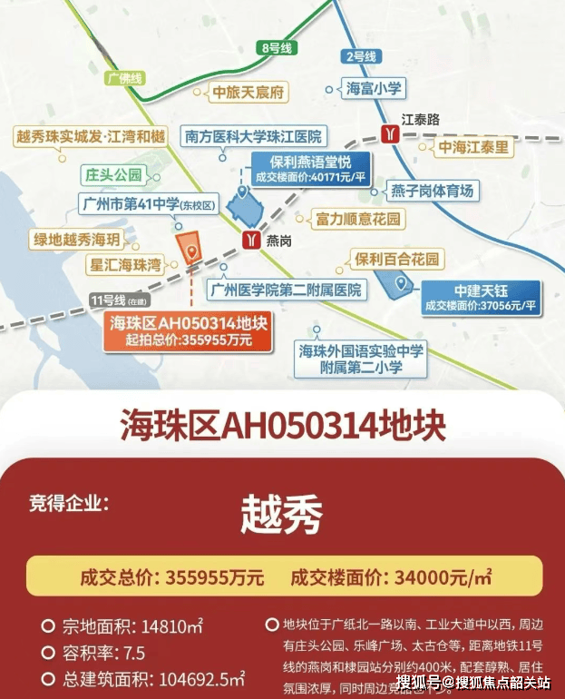 2024年9月19日,越秀地产以总价35.6亿元、楼面价3.4万/㎡的价格拿下了广纸314地块。该地块占地面积约14,810平方米,出让面积为13,959平方米,总建筑面积约为104,693平方米。尽管地块体量不大,但凭借其优越的地理位置和周边配套,广纸板块已经成为海珠区重点开发区域之一。特别是这块地在户型设计上达到了120%的使用率,并且背靠越秀·星汇海珠湾这个成熟大盘,进一步提升了项目的吸引力。
